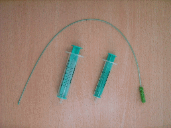 Sonden dienen u.a. zur Nahrungsgabe nach Operationen im Mundbereich.Die Bilder zeigen eine Sonde der Fa. Unomedical in der Größe 6 (40 cm) und Spritzen der Fa. Braun (10 ml) zum sondieren, sowie (5 ml) zur Überprüfung, ob die Sonde richtig liegt.