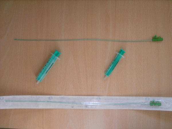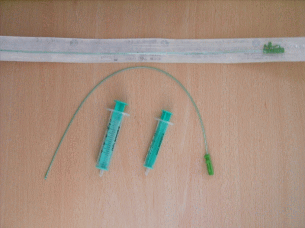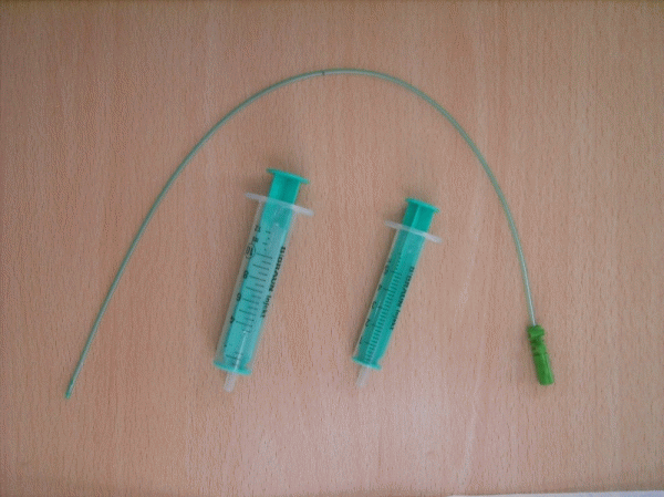 Sonden dienen u.a. zur Nahrungsgabe nach Operationen im Mundbereich.Die Bilder zeigen eine Sonde der Fa. Unomedical in der Größe 6 (40 cm) und Spritzen der Fa. Braun (10 ml) zum sondieren, sowie (5 ml) zur Überprüfung, ob die Sonde richtig liegt.